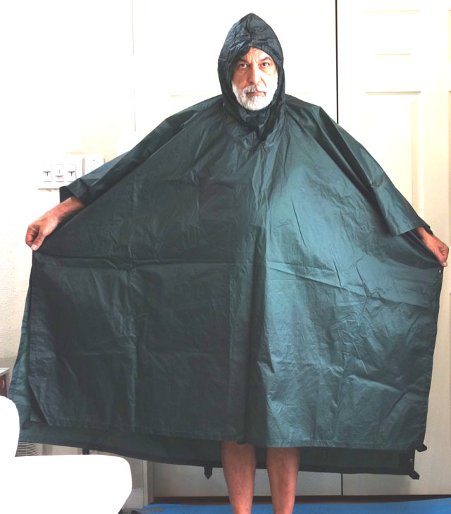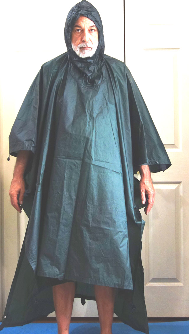 Today, and for the past few years, I am back to a poncho. Until a couple years ago I used a GoLite Poncho/Tarp and then a Mountain Laurel Designs Silnylon Pro Poncho/Tarp. The GoLite was reasonably priced and weighs 10 ounces. The Mountain Laurel version is lighter at 8.8 ounces, provides better coverage as a shelter, is more difficult to learn to pitch (has a catenary sloped ridge), and was twice as expensive as the GoLite. My model of the GoLite poncho is no longer made, and GoLite now advertises a waterproof breathable poncho tarp — buyer beware.