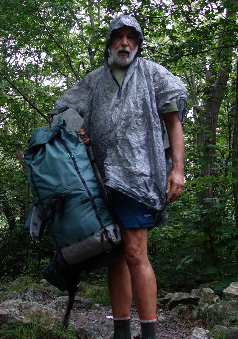 The zPacks poncho is smaller than the typical poncho/tarp so it rarely catches on brush, even when descending desert canyons off-trail. However, it does not reach all the way down to my knees causing cold thighs in some wind-driven rain. I solved this with a zPacks Cuben Fiber rain skirt at 1 ounce.