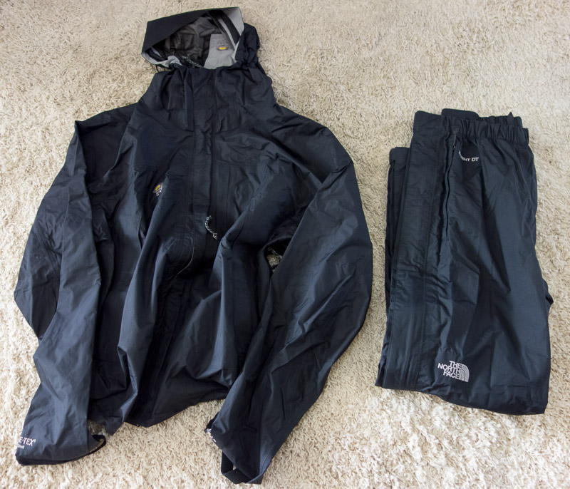 Above (L to R): Mountain Hardware Typhoon Gortex Packlite Jacket (size large at 14.1 ounces) and a pair of The North Face Venture Side Zip Rain Pants with HyVent DT “WPB” material (size medium at 12.8 ounces). Neither breathe well or are truly waterproof.