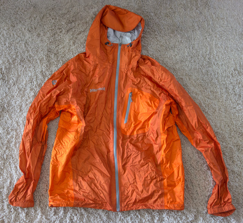 Above: Marmot Essence Jacket with Membrain Strata “WBP” material (size large at 6.7 ounces). Doesn’t breathe well and will eventually wet-out.