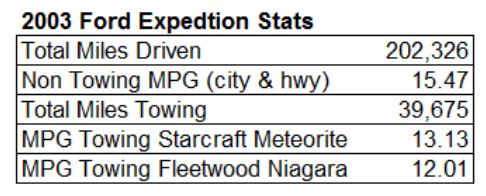 Actually it was one of two different Expeditions. In 2012 our beloved Fleetwood Niagara was destroyed by vandals and totaled by our insurance company. Joyce wanted a travel trailer, which I was okay with – but our 2003 Expedition, which had a V-6 engine could not tow anything over 6,000 lbs. So Joyce told me to go buy a new tow vehicle (gotta love a wife that tells her husband to go buy a new truck).