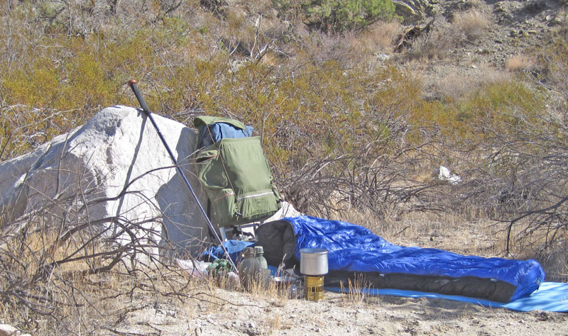 Under these conditions, site selection become of utmost importance. If it is raining, I am usually wearing a poncho, which has kept both me and my backpack dry. Whenever possible, I try to locate a spot under a tree or large shrub to keep the pack dry while I set up my shelter. Once the shelter is in place, I place the groundsheet, mat and sleeping bag/quilt inside. Shoes are removed and I get inside my sleep system before unpacking, cooking, and organizing gear.