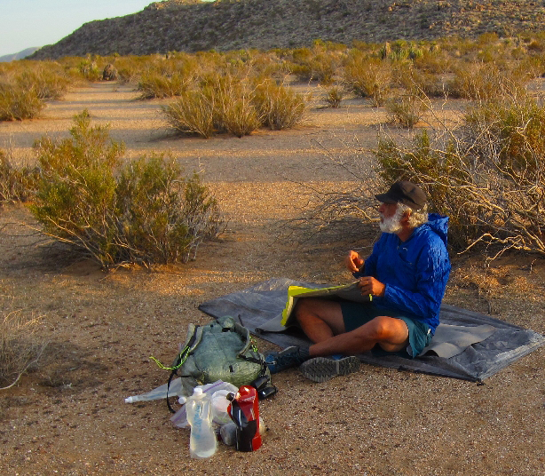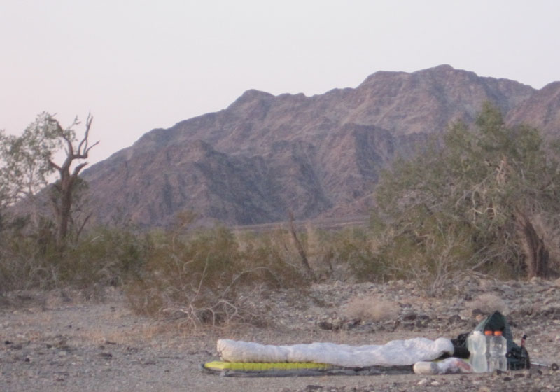 I like to hike until just about dark. With planning I often reach a water source at the same time I stop for the day. When this happens, I set up my sleep system a short distance from water and far enough way so animals can get to water without being stressed by my presence. Once my campsite is set up, I walk to the water source and fill my water bottles. Back at camp, I slide into my quilt or sleeping bag and prepare dinner.