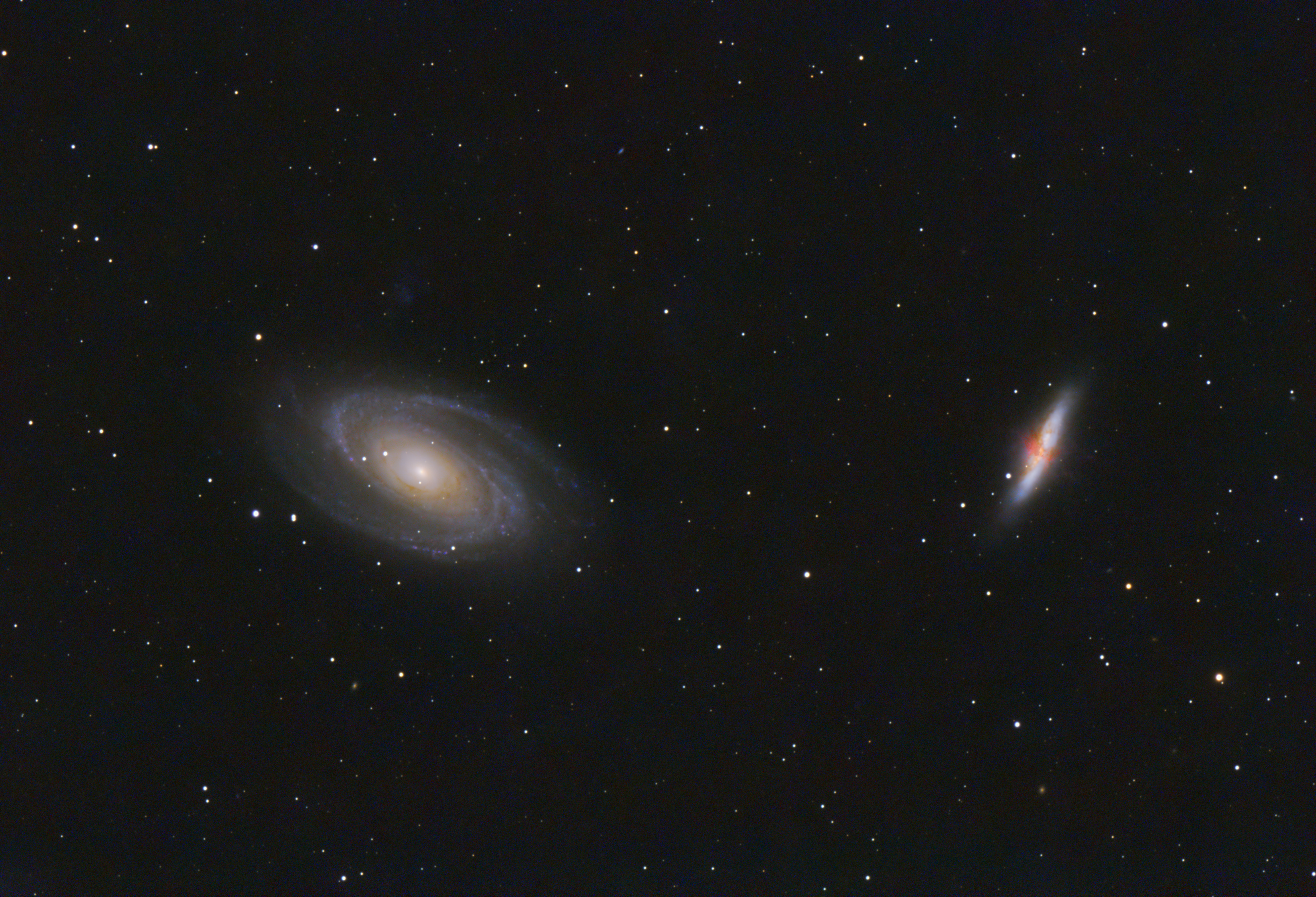 Messier 81 (Bode’s Galaxy) and Messier 82 (the Cigar Galaxy) form a famous and contrasting pair of galaxies in the constellation Ursa Major, located about 12 million light-years from Earth. M81 is a classic grand-design spiral galaxy with a bright central core and well-defined spiral arms laced with dark dust lanes and regions of star formation. It appears smooth and orderly, making it one of the finest examples of a spiral galaxy visible to amateur telescopes.