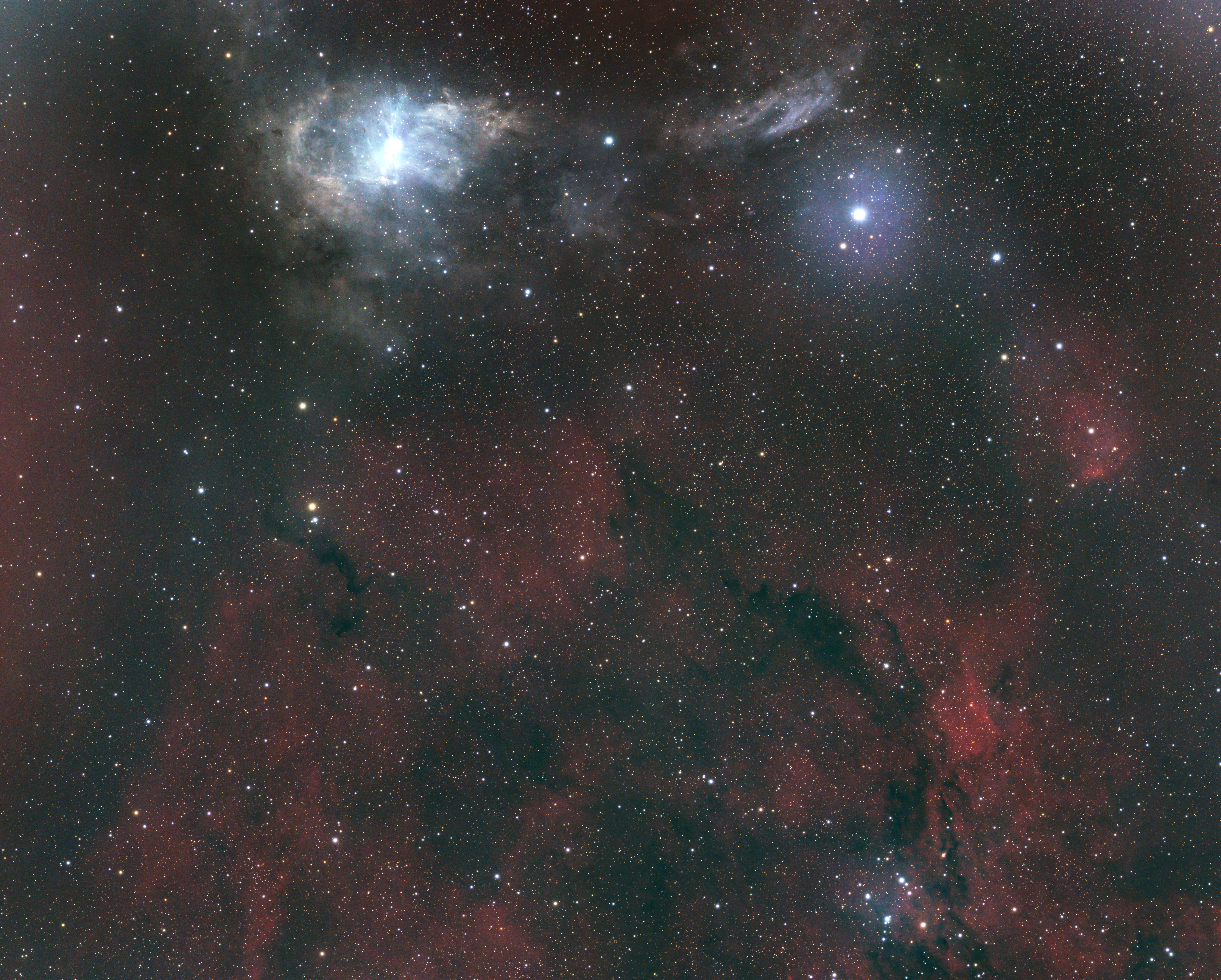 • VdB 15, located nearby, is slightly larger and also illuminated by a young, hot star. Its light is bluish due to the preferential scattering of shorter (blue) wavelengths of starlight by dust particles. VdB 15 often appears connected to VdB 14 through faint extensions of nebulosity, forming a charming duo in deep-sky images.