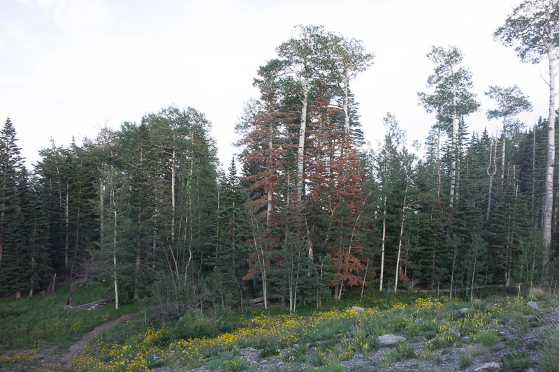As I got to around the 7,000 foot elevation level I started to see a lot of bark beetle damage, something that is familiar in Southern California. Bark beetles attack trees that are weak from drought, smog or disease. New Mexico, like Southern California has been suffering from drought conditions over the past few years. Thousands of trees in Sandia Mountains have died from the beetles.