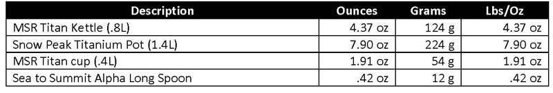 The Caldera and LiteTrail don’t need a separate pot. With the Snow Peak I use a MSR Titan Kettle (.8 liters/28 fluid ounces). If I am using the WindPro or Dragonfly, I am melting snow and need a larger pot, which is a Snow Peak Titanium Pot (1.4 liters/48 fluid ounces).