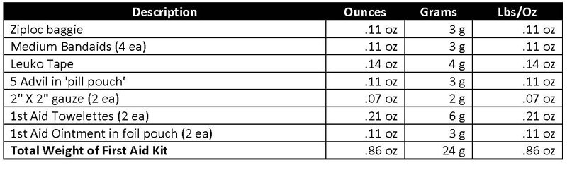 The experienced solo backpacker is careful and rarely gets injured. Most injuries are minor cuts, scrapes, bruises and blisters. Being smart, careful, and knowing how to improvise outweighs any first aid items in your kit. Over the years I have stopped taking any first aid item I never used, and my kit is quite small.