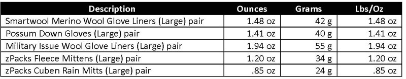 On most trips I take a pair of Smartwool merino glove liners or a pair of Possum Down Gloves. If I expect temps to be around freezing at night, it’s a pair of military surplus wool glove liners. In winter with snow, I take several pair of merino wool liners, zPacks fleece mittens with Cuben rain mitts – gloves will get wet in snow, so you need extras! For really cold weather; a pair of Marmot insulated Randonnee Gore-Tex Gloves with insert liners.