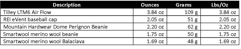 In cold weather I like the Mountain Hardwear Dome Perignon Beanie. It’s warm, comfortable and windproof. If it is really, really cold I’ll take a Smartwool Merino wool baclava to layer under other headwear and to cover my nose and mouth.