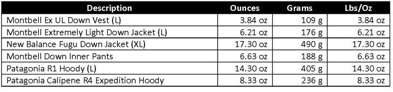 10/24/2016: I can no longer find the Montbell Ex UL Down Vest, Ex Light Down Jacket, or the Down Inner Pants. Not sure if they are discontinued, but if you can find them, they are highly recommended. The New Balance Fugu Down Jacket was discontinued years ago too and New Balance doesn’t make anything like it any more, which is too bad. The Patagonia R-1 Hoody is still available and the R4 Hoody is now called the Thermal Weight Hoody.