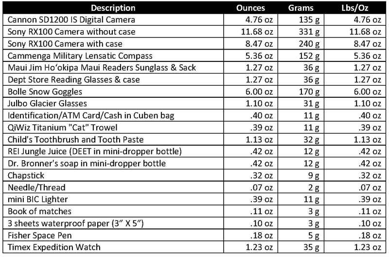 Watch: There are all kinds of fancy watches that can perform miracles. I mostly hike with an inexpensive Timex Expedition Watch that has an Indiglo backlight. It is several years old and I think I am on the 3rd replacement battery. Fabric bands are more comfortable than plastic or metal.