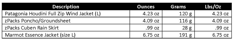 Once in a while I don’t take a poncho and on these trips I take a Marmot Essence rain jacket – usually when there is only a slight chance of rain.