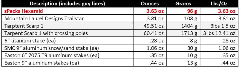 Stakes vary from small 6” titanium stakes, 9” SMC aluminum snow/sand stakes, Easton 6” or 9” aluminum stakes.