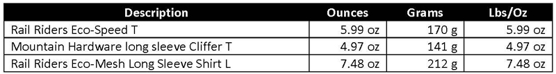 When wearing the shorts or woven nylon trousers (Rail Riders Eco-Mesh), these are usually the only layers I am wearing. I may put on a wind shirt or poncho if conditions dictate so. Sometimes in colder weather I may hike with a wicking layer under my shorts or trousers. There are many combinations, and mixing layers over the course of a trip gives the hiker many options and flexibility.