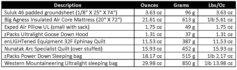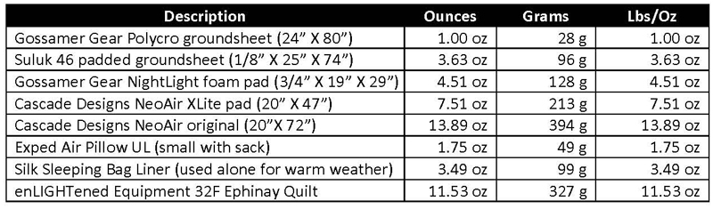 I consider this a ground sheet, pad, sleeping bag/quilt, headwear if quilt does not have a hood, and pillow (if used). Normally I don’t use a groundsheet because my foam pads are waterproof. I am slowly transitioning from sleeping on foam pads to air mattresses as I get older. Below is what I use on most trips: