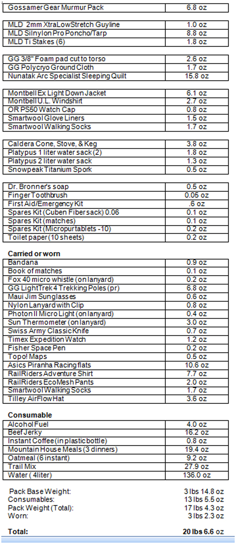 Sample Gear Lists from Actual Trips