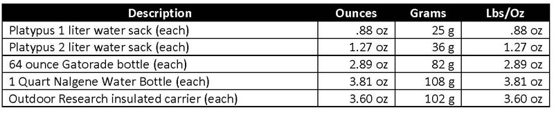 One most trips I bring a couple 1 liter Platypus soft water bottles. If I have short periods of time where I need a lot of water, I might bring an additional 2 liter Platypus.