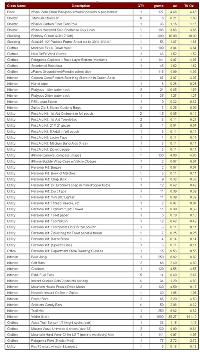 But many backpackers are constantly stressing over their gear, looking for the newest and lightest doohickey. They are constantly fretting about or tweaking their gear list or spreadsheet. All of this misses the point — just go out and walk in wild places. You can assemble a fairly light and functional kit by shopping at thrift stores, swap meets, mass market department stores, hardware stores, and sporting good stores. Many people make their own gear and clothes. There nothing wrong with improving your kit, but it is best to spend most of your time actually walking than playing with gear and gear lists at home.