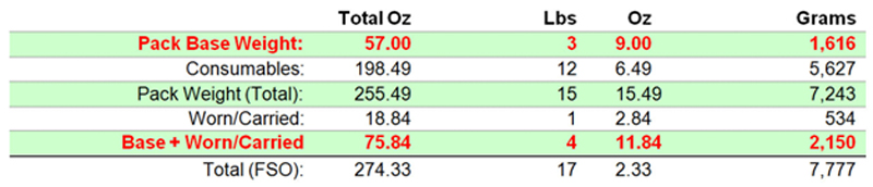 All gear in pack under 5lbs. Excludes food, water, or fuel (consumables)
