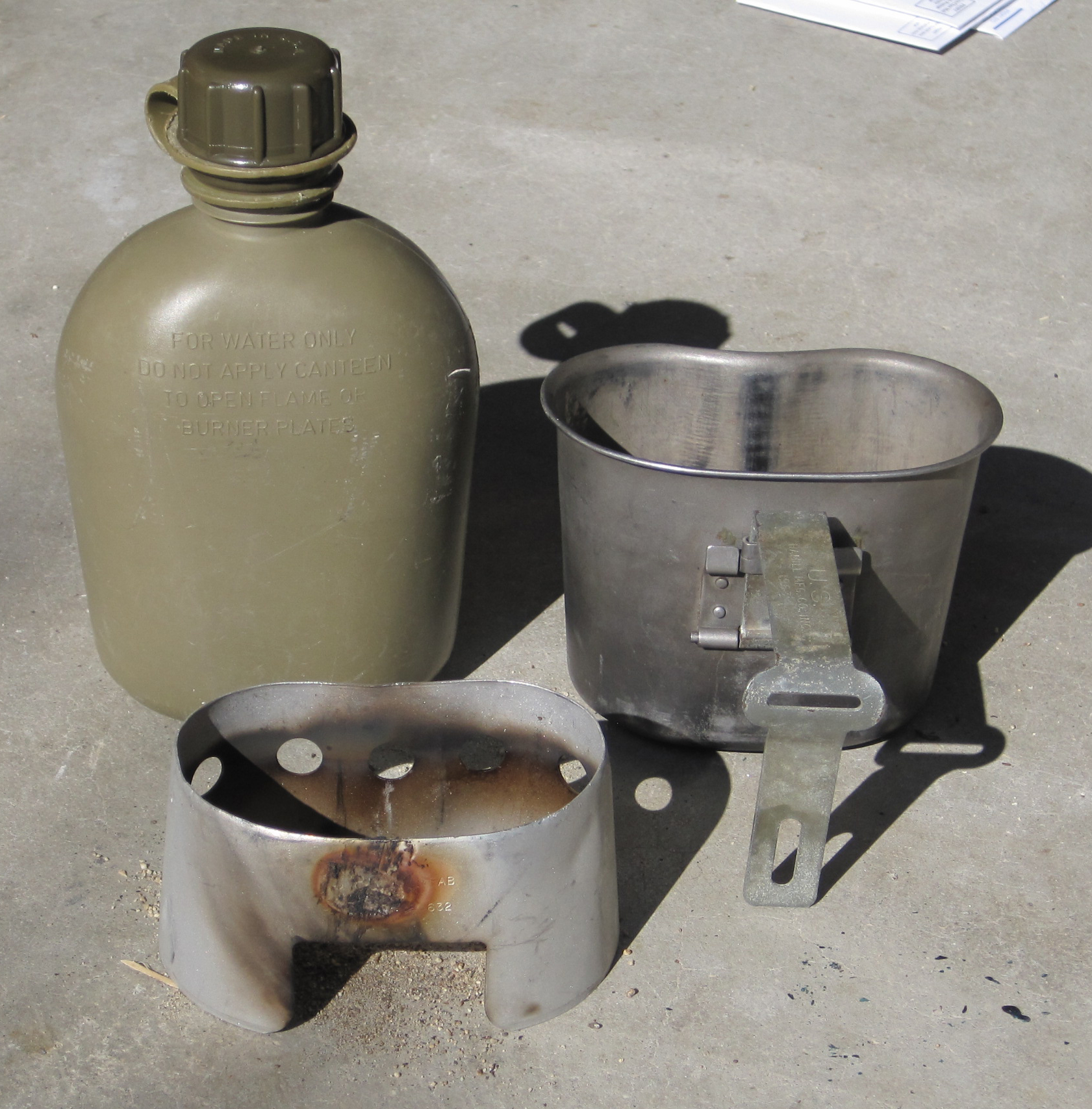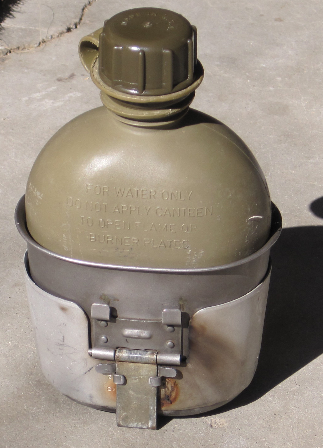 Canteen, cup, and stove nest into a single package.