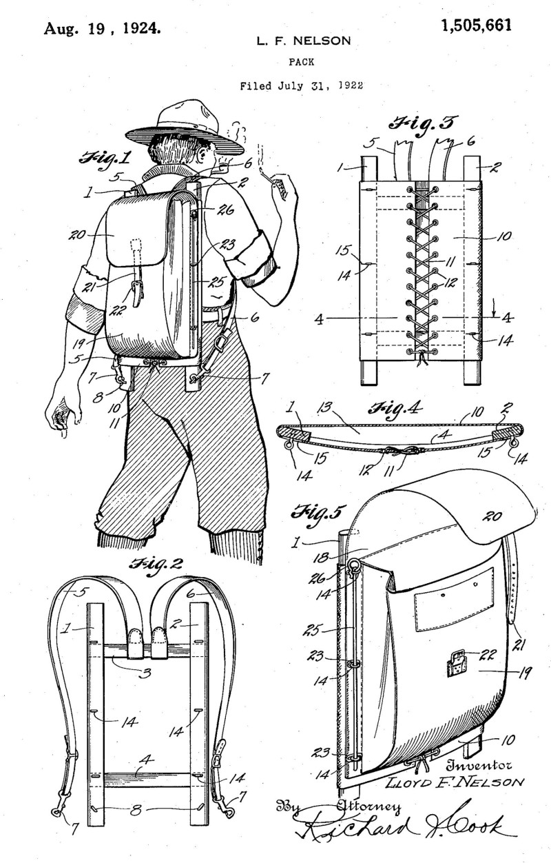 In the 1950’s Dick Kelty revolutionized the modern backpack with his curved aluminum tube external frame and nylon pack bags. Kelty packs, which weighed less than 4 pounds, were widely imitated by other companies. These modern marvels supplanted the wooden pack frame, the most famous being the wood and canvas Trapper Nelson.