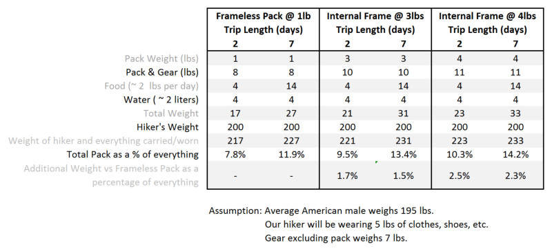 A hiker’s pack is his house on his back. It is the foundation and structure of everything he carries. The hiker spends most of his days carrying the pack. In most cases a frameless pack does not function well, especially given the hiker is only sacrificing a couple percentage points of the total weight his legs need to carry, and suffers a substantial reduction in carrying comfort. The table below shows how little impact a 3lb or 4lb pack has versus a 1lb pack.