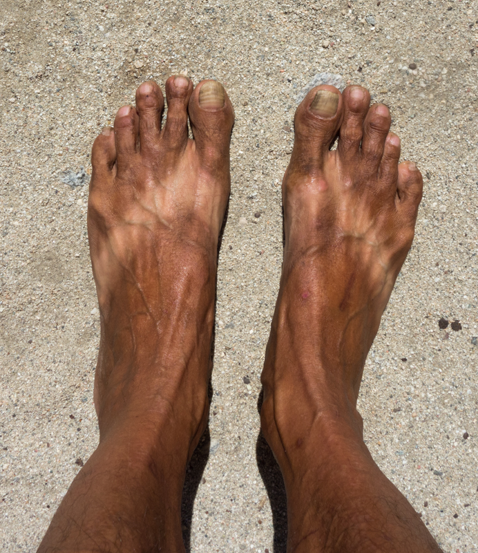 So today I was looking into a pair of strap sandals. Similar to flip flops, strap sandals are simply a sole held in place with straps; only more secure and eliminated the go-ahead syndrome inherent in flip flops. One reviewer, who supposedly uses sandals a lot posted pictures of his pasty white feet wearing several brands of sandals. I call BS. If you wear sandals or flip flops a lot, as I do, in the outdoors you will develop a tan with contrasting tan marks where the straps cross the feet. Something like this: