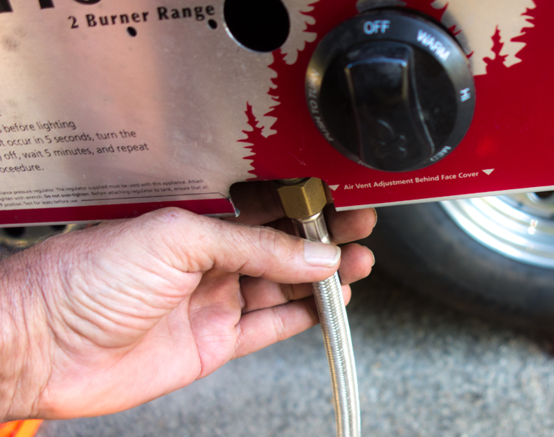 Our propane tanks are 26 feet away from the stove so no concerns about overheating them, but I wanted to make sure the stove wasn’t getting the fuel line too hot — finger test says, Okay