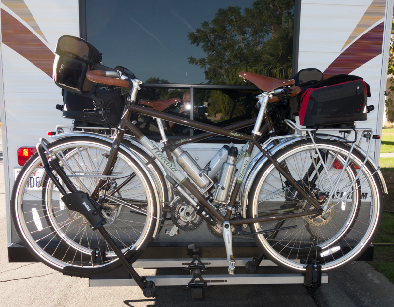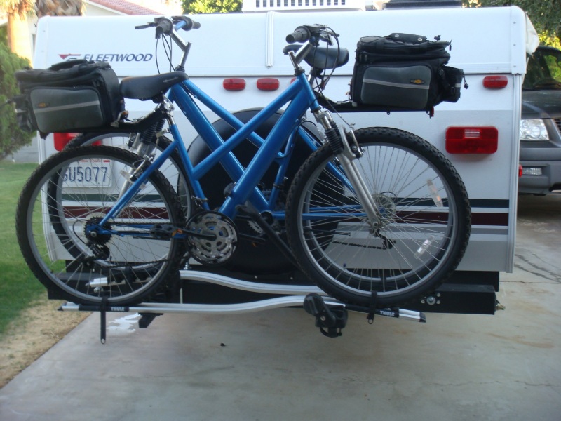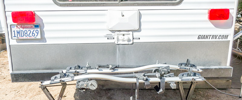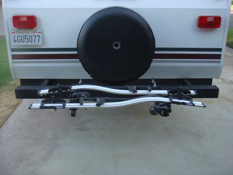 Note that the spare tire is mounted on the camper itself, recessed back from the bumper, which allowed enough room for the bikes to fit on the rack without interference from the spare tire.