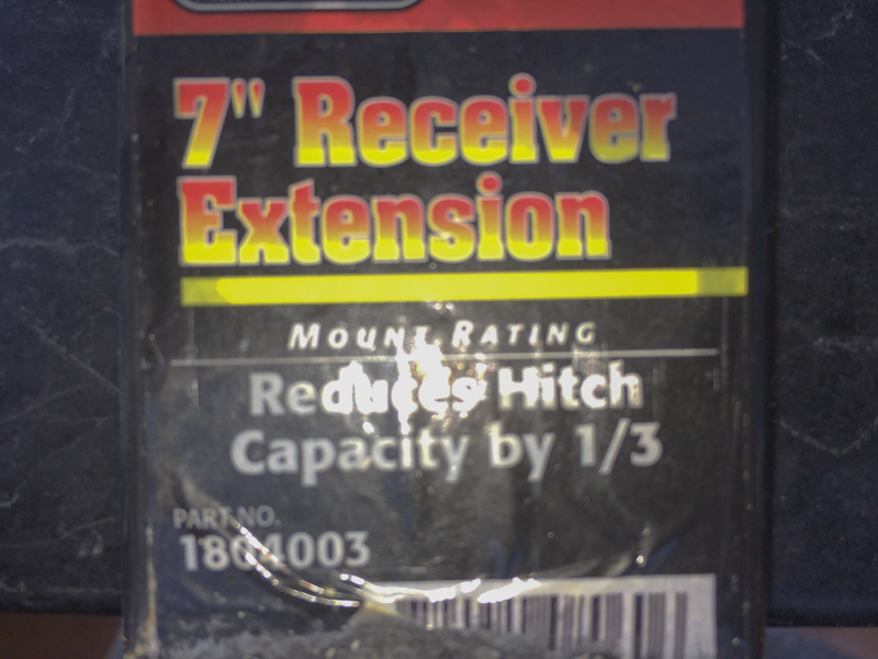 Notice that the extension reduces the hitch capacity by 1/3. The hitch is rated at 500 lbs, so the maximum I can put in the basket cargo carrier will be 335 pounds. The most we will ever need is about 225 lbs for our inflatable boat and outboard motor.
