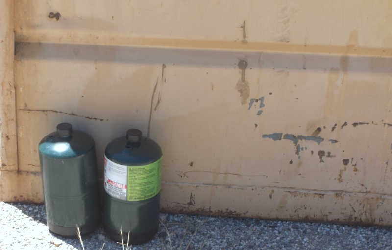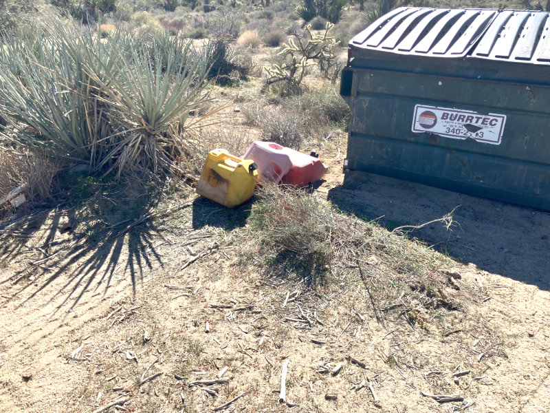 Apparently this camper knew the gas cans were not to be placed in the bin, as the bin was empty, or else they were too lazy to put them in anyway. As it turned out, the refuse company left the cans on the ground,
