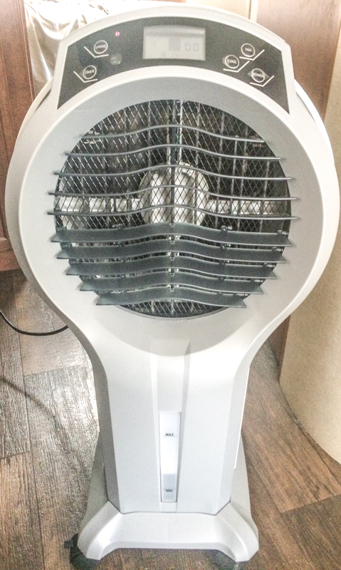 Staying cool in the hot desert during the day is simple: just stay in the shade. But as I get older, it is getting more difficult for me to sleep when the nighttime temperatures are 90F or higher. This June we spent a couple of weeks at Lake Mead and most days were above 110F and a couple hit 114F. Anticipating this, and not willing to stay in a parking lot campground with hook-ups away from the lake and in civilization, I came up with an idea – a portable evaporative cooler (aka swamp cooler).