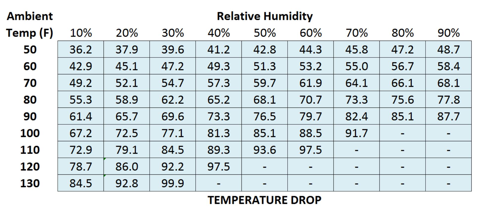 An evaporative cooler’s fan pushes much more air than a typical air conditioning system because a large airflow is required. The airflow alone will make you feel cooler. Below is a table demonstrating how a properly sized and efficient evaporative cooler will perform based on the ambient temperature and relative humidity.