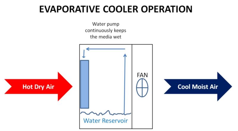 An evaporative cooler takes warm air and passes it through media soaked in water, and as it passes through the wet media the air absorbs the water and as the water evaporates it cools off. This water is blown through the living space and requires an open window to circulate the air out of the living space. To summarize: an evaporative cooler cools the air and adds humidity to the air.
