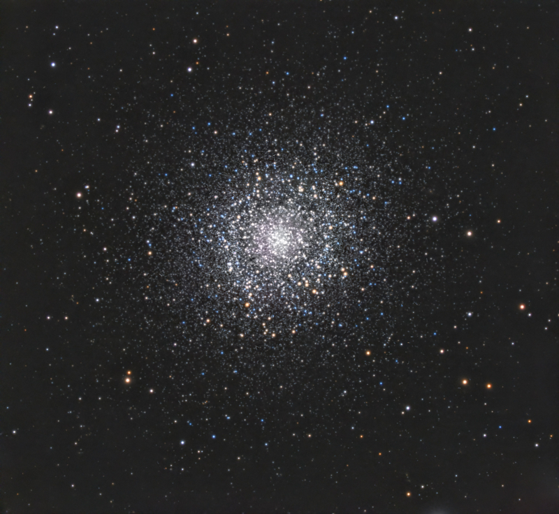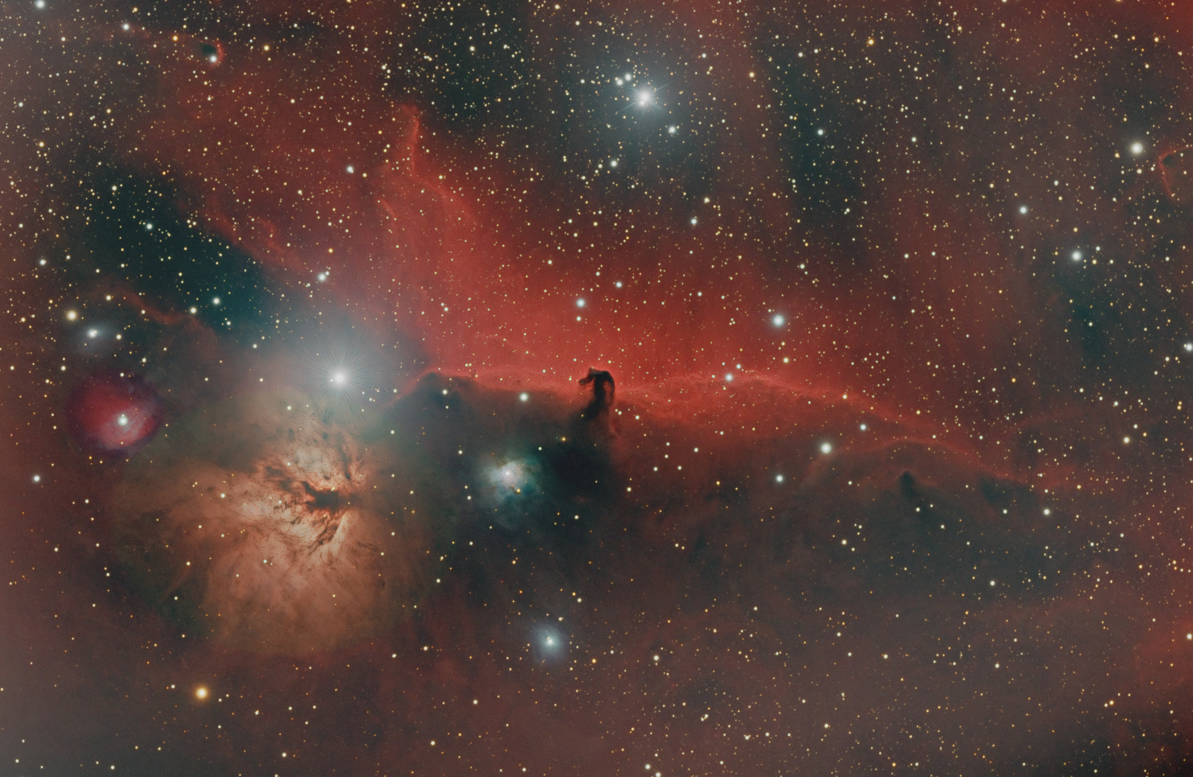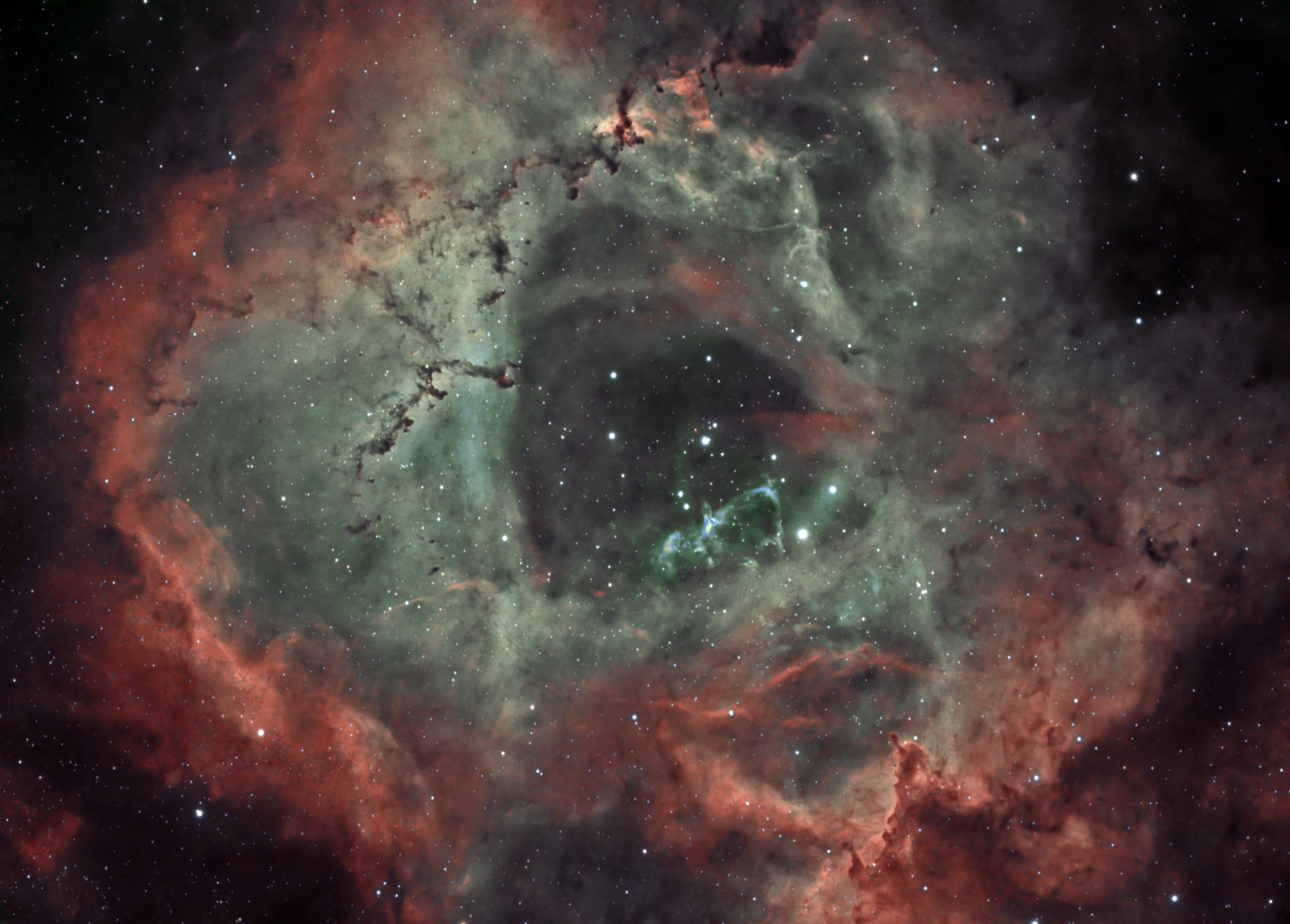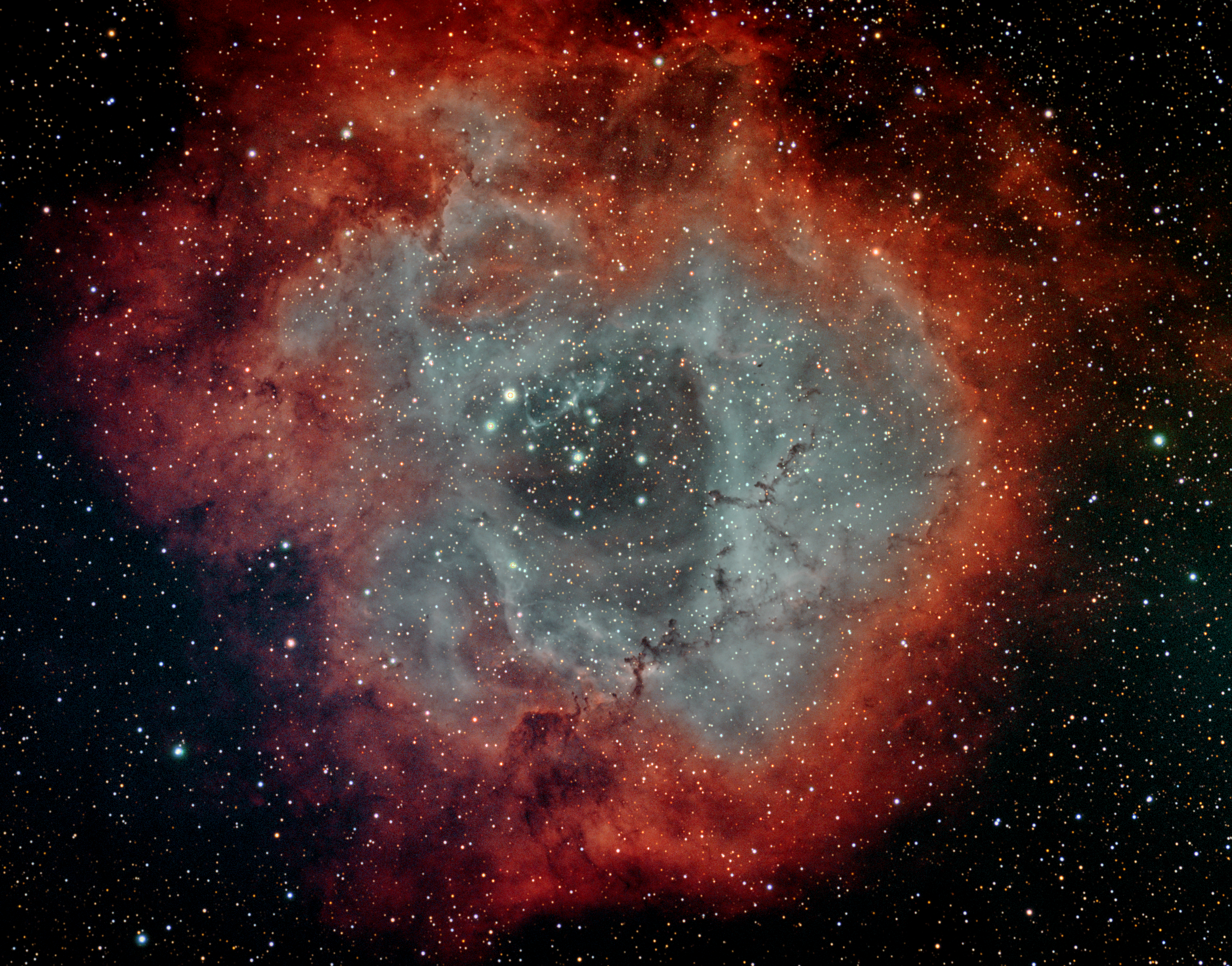 At its heart lies the young open star cluster NGC 2244, whose hot, massive stars flood the surrounding hydrogen gas with intense ultraviolet radiation. This energy causes the nebula to glow a rich red in hydrogen-alpha light while also carving out a central cavity, giving the Rosette its characteristic hollowed appearance. Dark Bok globules and twisting dust lanes weave through the brighter regions, hinting at ongoing and future star formation.