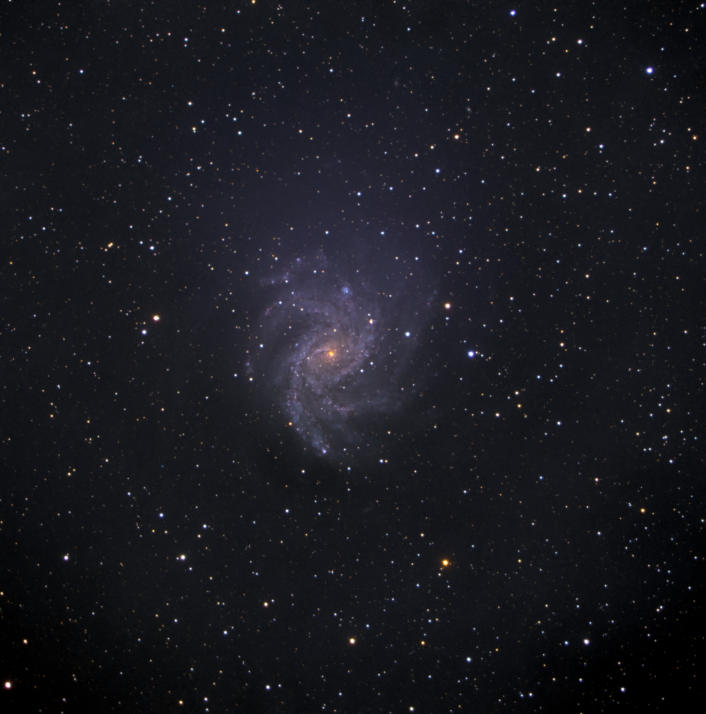 At its center lies a relatively small and subdued nucleus compared to many spiral galaxies, but the surrounding disk is vast and active, spanning roughly 40,000 light-years. Despite its brightness, NGC 6946 is somewhat challenging to observe because it lies close to the plane of the Milky Way, where foreground dust dims and reddens its light.