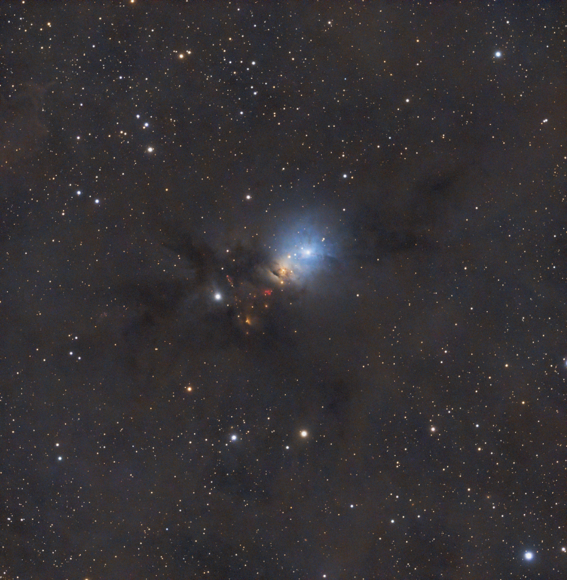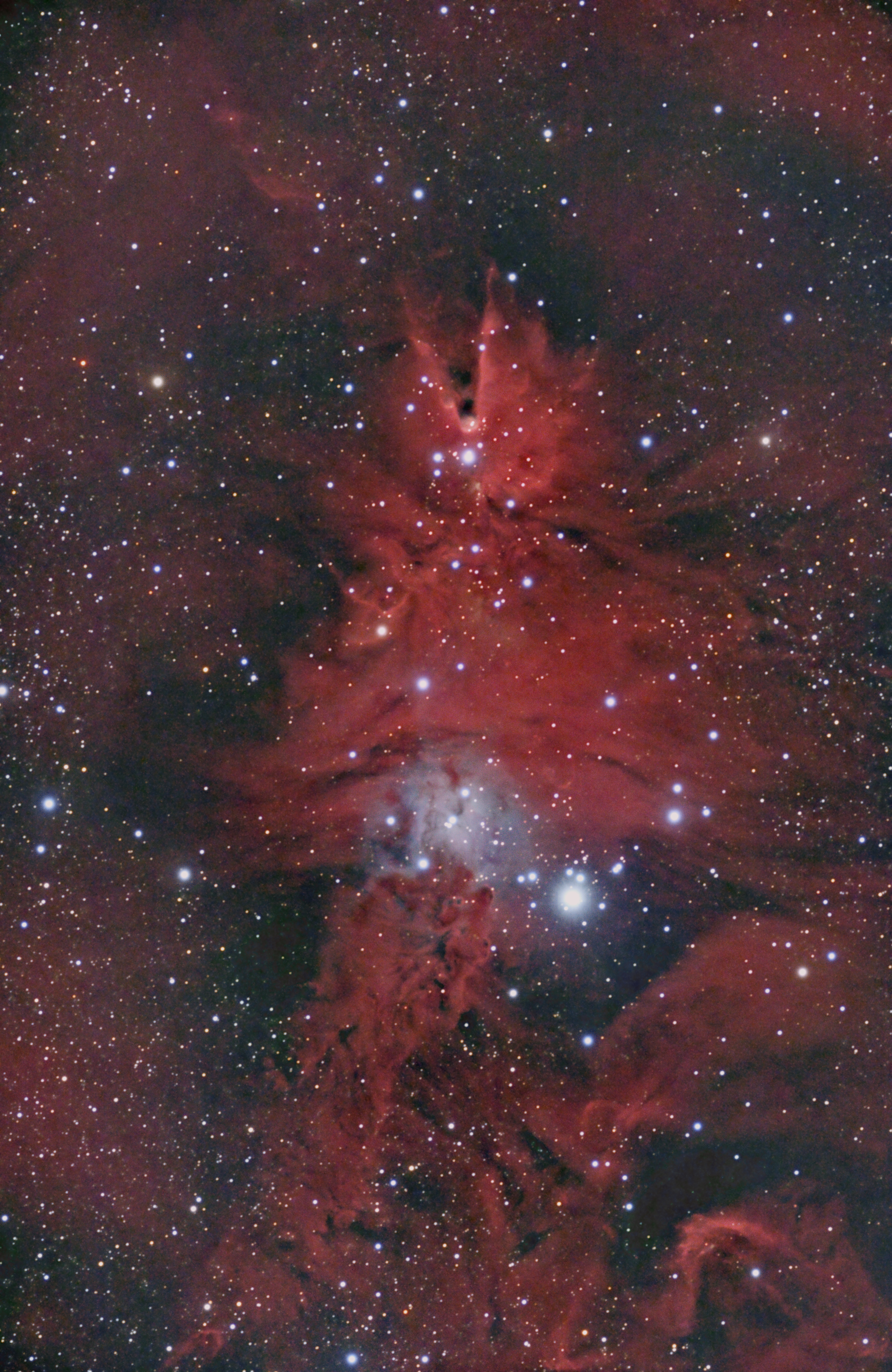 Embedded within the same region is the Christmas Tree Cluster (NGC 2264 proper), a young open cluster whose stars trace a distinctive, tree-like pattern. Bright, blue-white stars form the “branches,” while reddish nebular glow and scattered dust give the cluster a festive, ornamented appearance. At the top of the tree lies the bright star S Monocerotis, whose energetic radiation illuminates and influences the surrounding nebula.