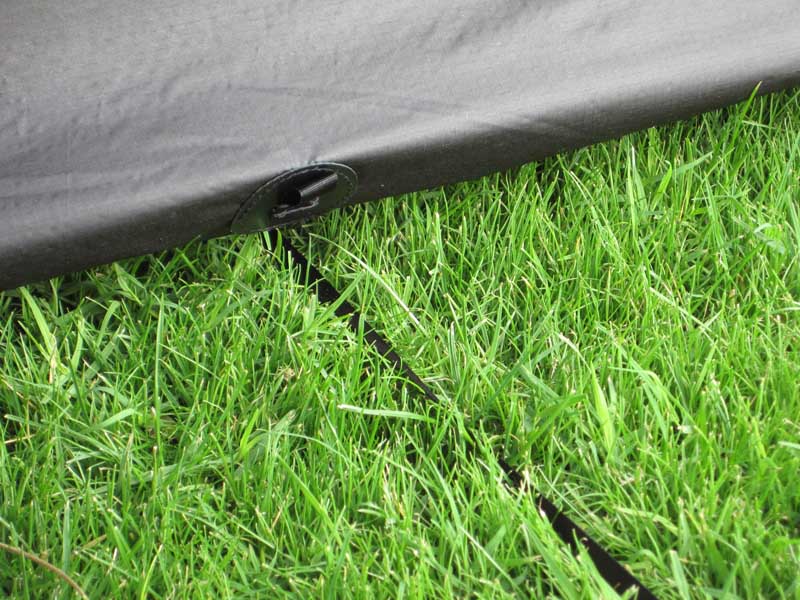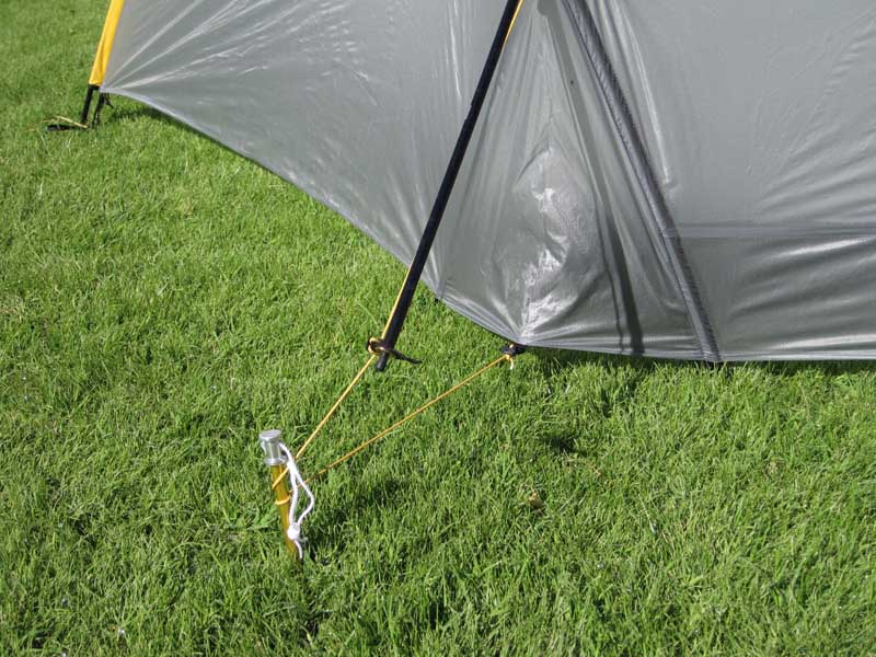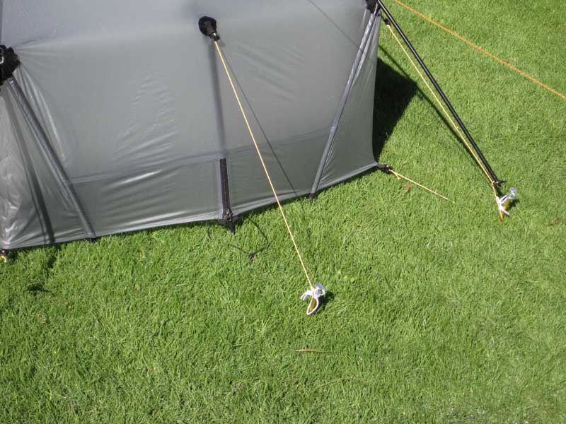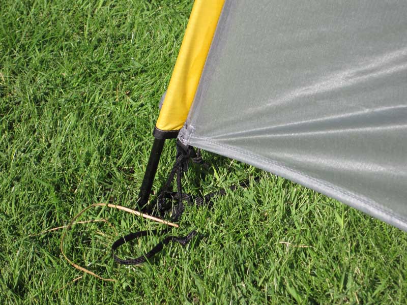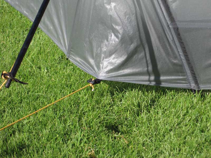 Corner tie-out. The cross pole connects to a grommet in the upper cord. Both the bottom cord and the upper cord have an adjuster sewn into the fly material. After using the tent several times without the crossing poles, I found the corner guys a little too short causing the corners to lift up. I have since installed longer pieces of cord.