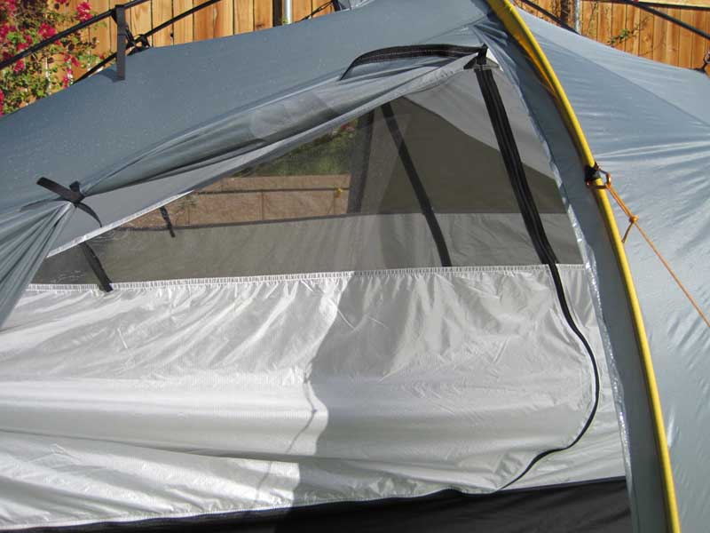 Side view with rain fly door open. The bottom bathtub floor is the black stripe, center of the nest is nylon and the top section is mesh. As you can see, the vestibule is fairly large and there is one on each side. Normally I store gear on one side and cook on the other.