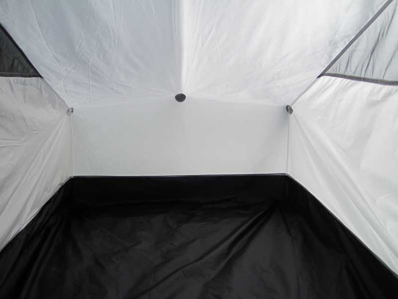 Interior view. Notice how the mesh goes all the way to the end of the inner. The 3 dots are patches that hold the inner clips for attaching to the fly. It is not easily visible, but the black bottom is the bathtub floor with extends up a few inches from the ground.