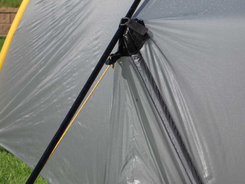 This is where the cross-over poles are secured above the corner “V-strut.” It is a d-ring and Velcro strap. The yellow cord is the tie-out and you can see the built-in cord adjuster.