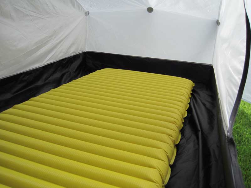 Regular size NeoAir inside. It is centered on the floor. Has about 6″ of space at the top and bottom and a little more on each side. I did not measure it, but there is plenty of interior room for the solo hiker. In use there is plenty of room for sleeping and keeping odds and ends inside the tent for easy access at night. Also, at 5’11” I find it easy to sit up inside, but I have to scoot a little bit towards the center.