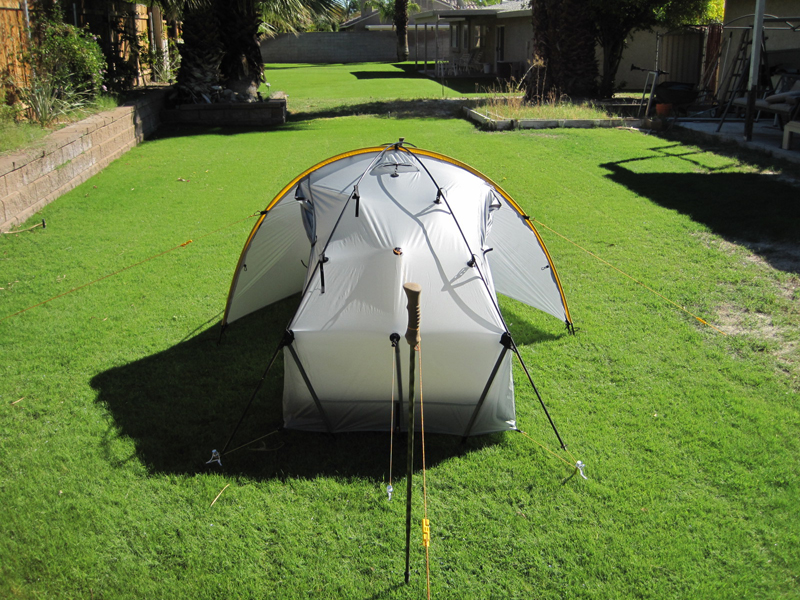 Here is the tent with everything. Optional crossing poles, tie outs on the main hoop and optional canopy support using trekking poles. The side tie outs really made the tent much more secure. I don’t think the optional canopy support with the trekking poles, might help during snow for snow load, but really does not help stabilize the tent.