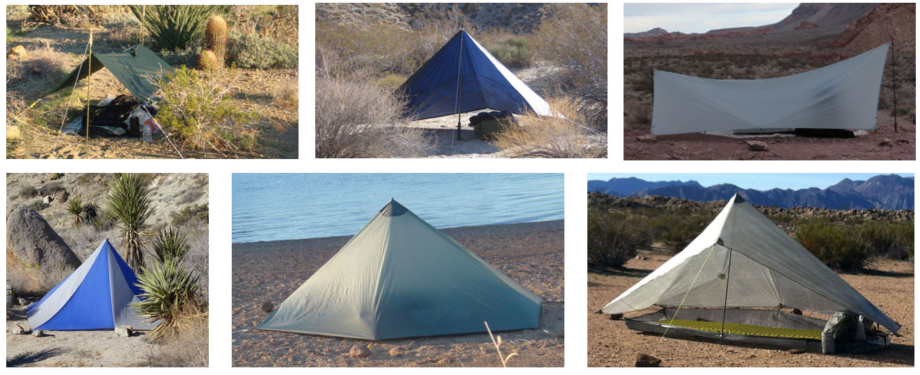 In the spring and fall the wind in our local deserts can get somewhat severe (gusts of 70+ mph). Along with the wind, gritty sand gets into everything: eyes, nose, ears, hair, gear, food, etc. As you can imagine, lighting a stove isn’t a simple thing to light or operate in this kind of weather. Over the years, my main shelters have been tarps or variations of a tarp (pre-determined shape without a floor). Above: Top row (L to R) poncho tarp, flat tarp, Gossamer Gear Spinn Twin flat tarp with a catenary cut. Bottom row (L to R) Chouinard Pyramid, Six Moons Wild Oasis, zPacks Hexamid.