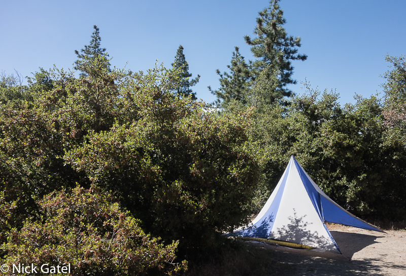 A couple weeks ago I finished the resuscitation of my old Chouinard pyramid shelter. (That’s another story you can read about here). The weather forecast was zero change of rain, but I brought the shelter to test it out. Since I was brining the old tent, I decided to go whole-hog and bring most of my older gear. Old doesn’t meany heavy — total weight of everything to include food and water was under 20 pounds.