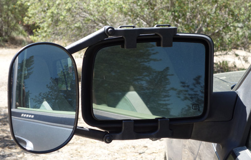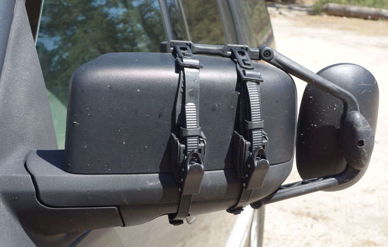 They were fairly easy to install, taking only a couple minutes. There are two adjustments (1) a top strap and then a ratchet mechanism to tighten them. I should have probably shortened the top strap adjustment a tiny bit so the rubber bumper is a little higher than in the picture above. But there was no noticeable vibration even at freeway speeds and the mirrors stayed secured when driving on dirt roads. The mirrors provide the required view behind the trailer.