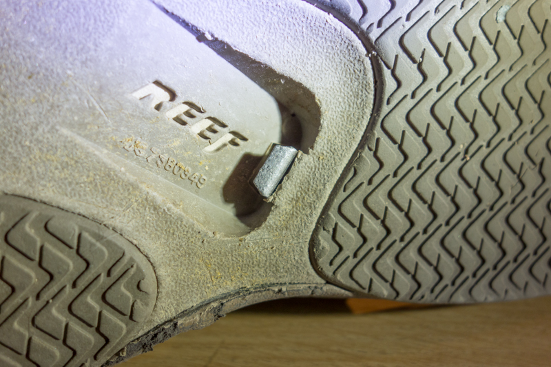 As I mentioned earlier, go-aheads evolved into more robust footwear in the 70’s and my Reef’s have a unique feature I discovered last year when I stepped on a pile of dog shit. Joyce has a bad attitude about tracking in dirt or other organic debris, like dog shit, into the house. Fortunately I noticed the dog shit before making my domicile entrance, and commenced cleaning the bottom with a stick, when I noticed a steel nub in the bottom. I checked the other one and also found a steel nub. Having no idea what they were for, so like the resourceful American I am, I Googled it.