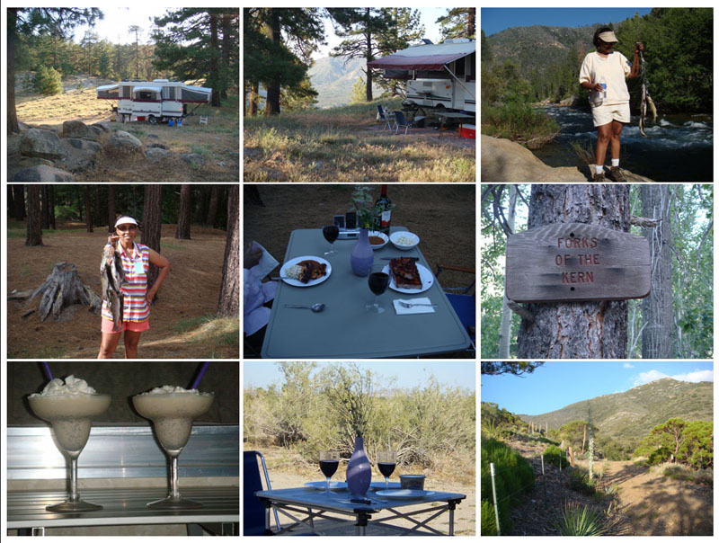 I guess I just don’t understand the evangelists who try to get people to backpack, or try to get backpackers to go ultralight, or try to get people to change their religion or politics. When Joyce and I go places I want to do the things both she and I enjoy. And if our hikes take us to high mountain streams with trout, she is even happier. To be honest, it is a great feeling to come back to the camper and take a shower, have a drink, cook a gourmet meal (at least by my definition), sit outside in clean warm clothes, and sleep in a bed with a gas heater. Makes for a great trip. Below is a collage of some of our camping, hiking, and fishing trips.
