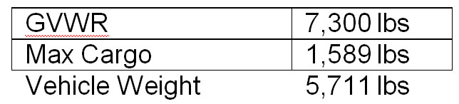 This is found on another sticker above the cargo sticker. Ours is 7,300 lbs. So here is what we end up with: